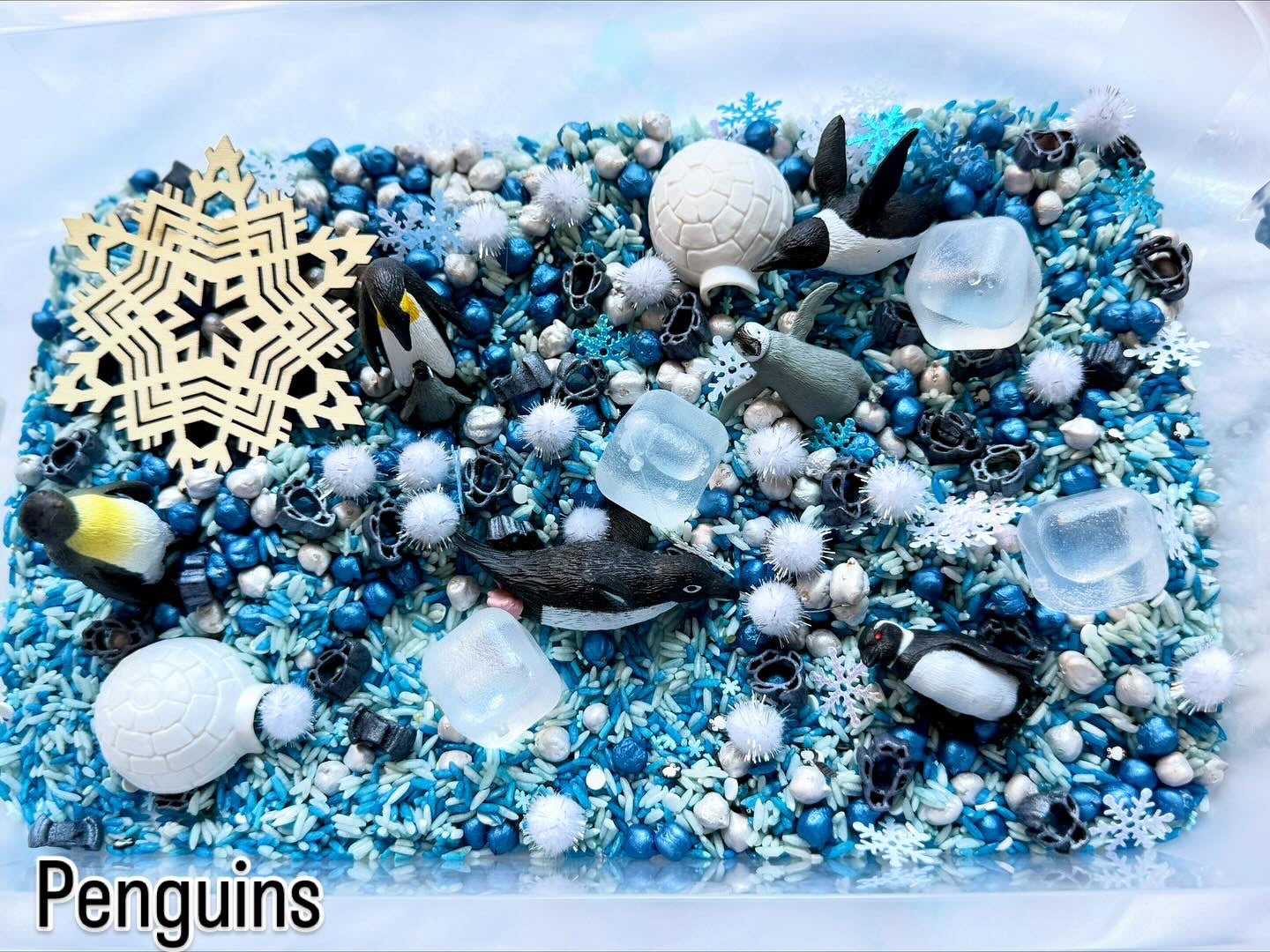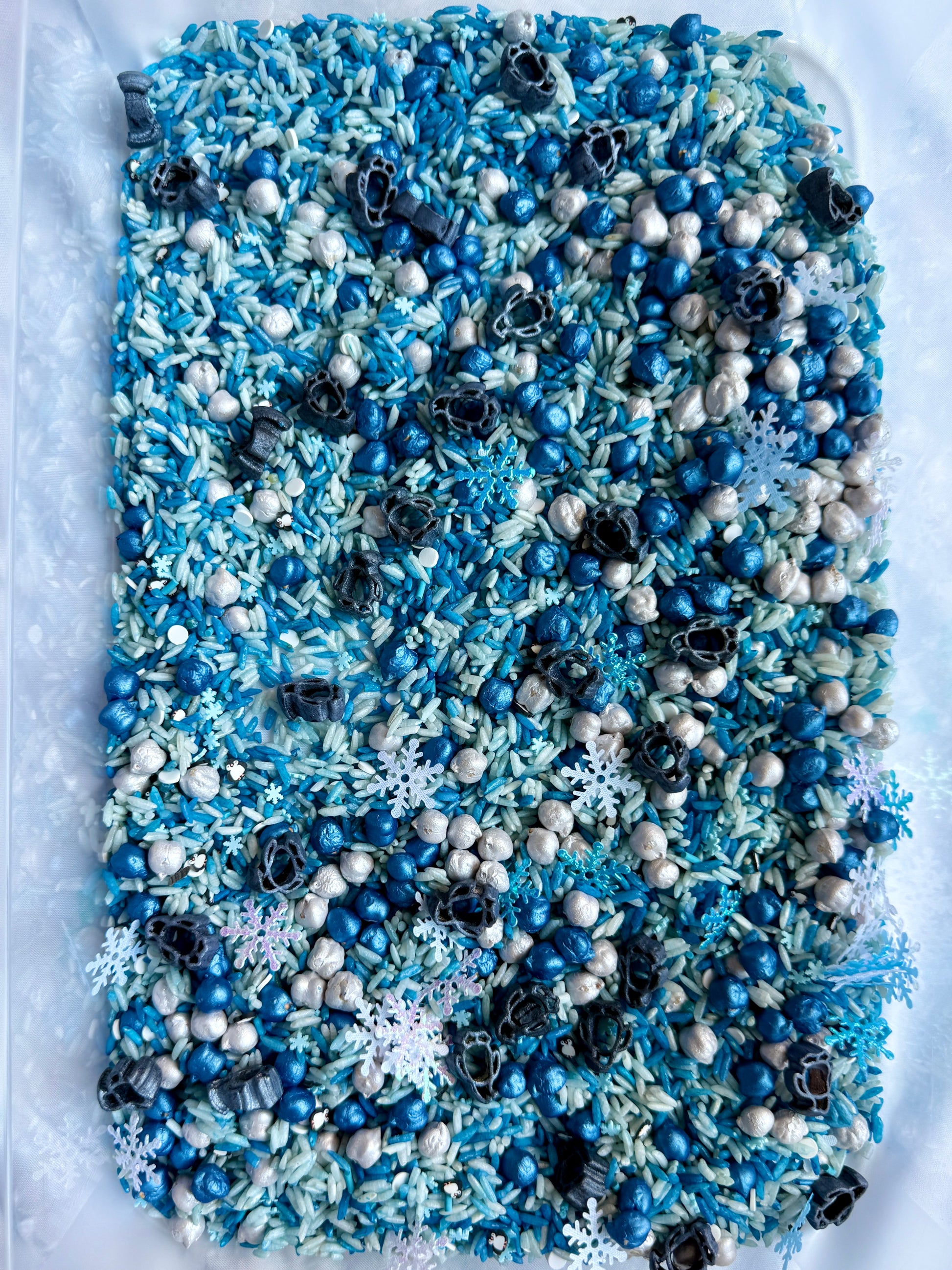• A hand-dyed sensory base in layered blues and whites to mimic snow, ice, and ocean. (Rice, chickpeas)